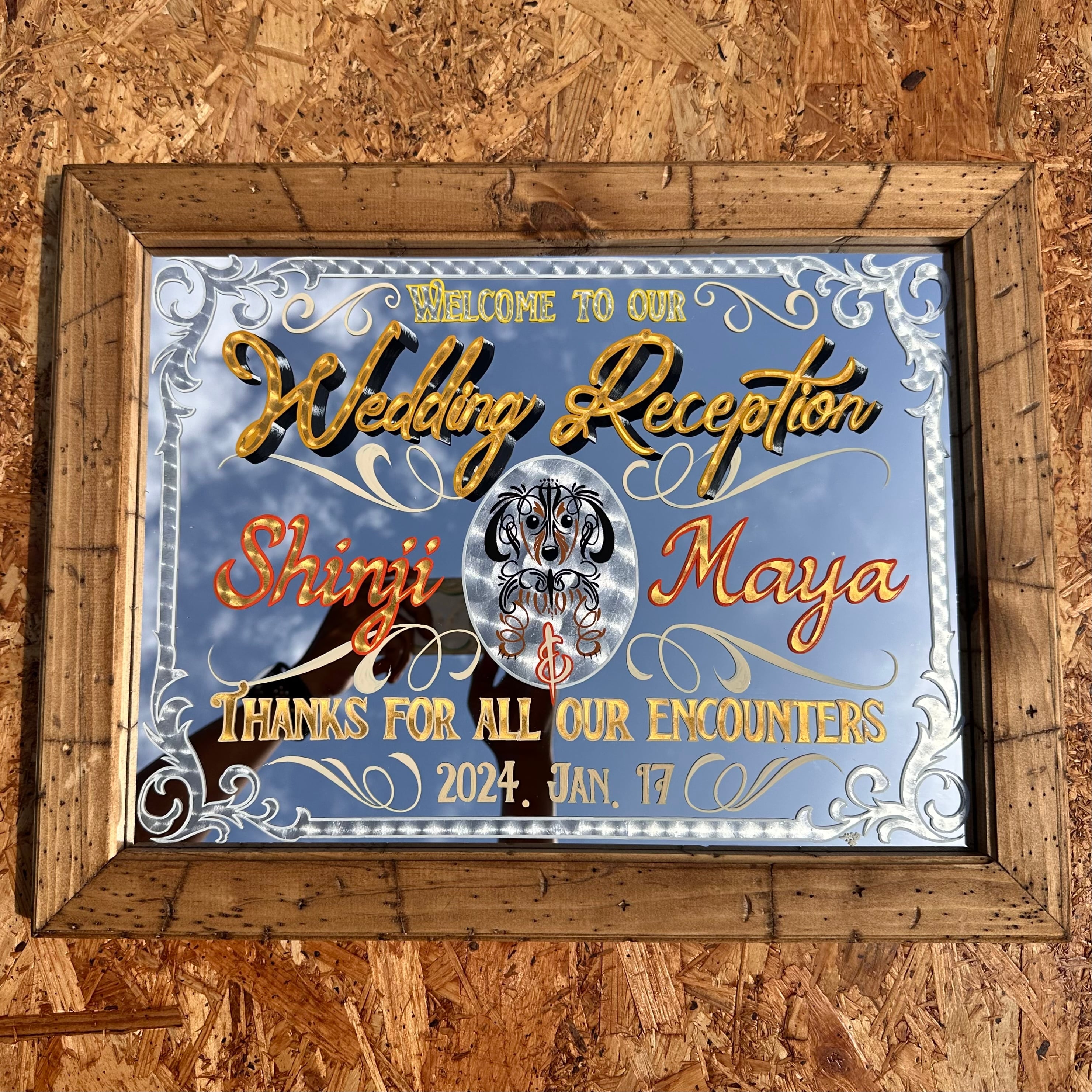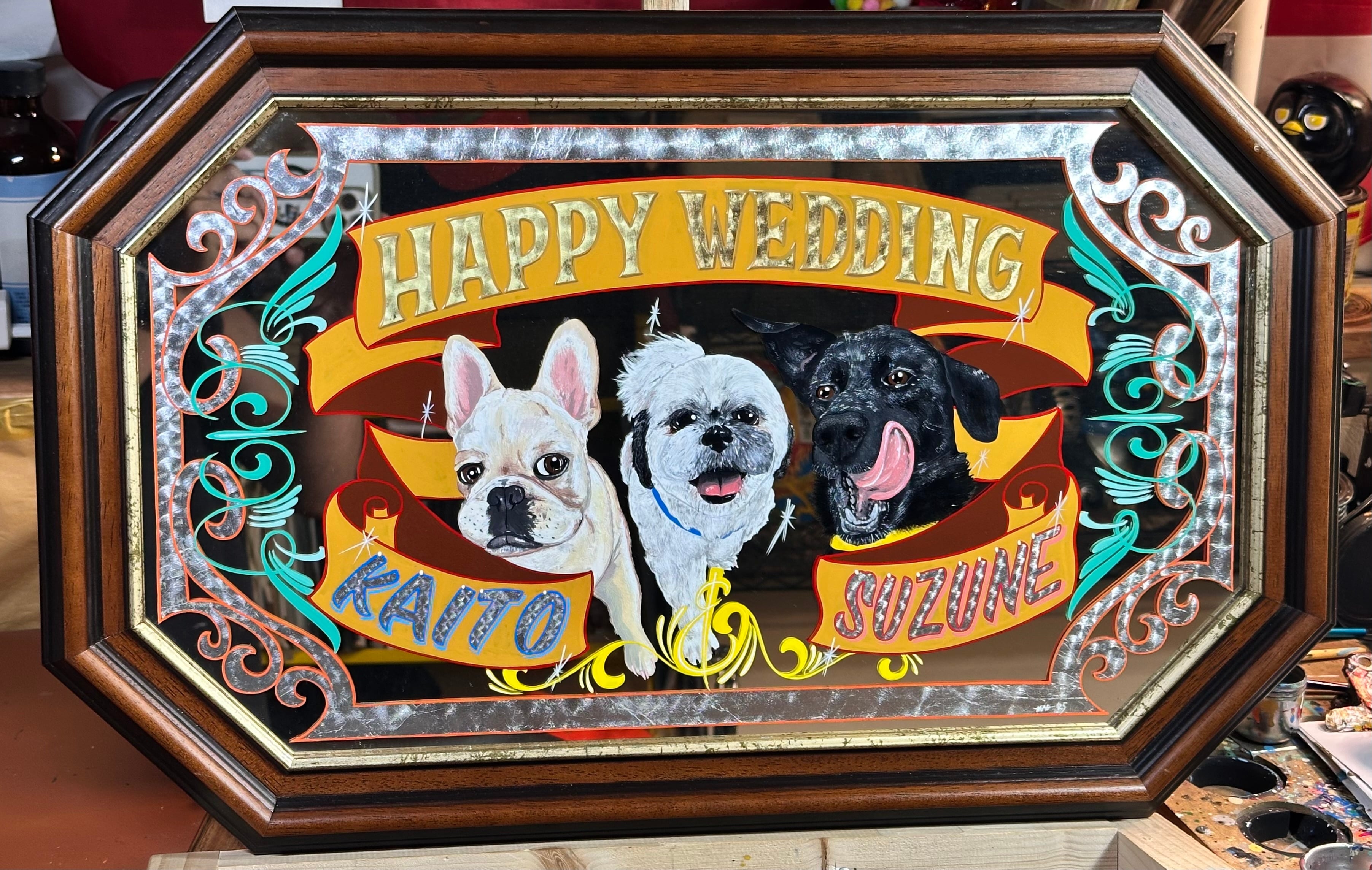 ウォーターギルディングというガラスにゴールドリーフを貼る技術を使った今年の干支とオリジナルキャラクターMADくんのコラボアート。随所にシルバーリーフやカッパーリーフ等、種類の違うリーフで豪華に仕上げてあります。ガラスの裏から施工してるため傷などの心配もありません。壁掛け用の金具付き 【サイズ】約27×22cm 【材質】 木、ガラス、k24ゴールドリーフ、k18ゴールドリーフ、シルバーリーフ、カラーシルバーリーフ、カッパーリーフ 【注意事項】 販売している商品は仕入れの段階で細心の注意を払って検品していますがアンティーク雑貨等に関しましてはキズや汚れ等はご了承ください。 商品に描かれているものは全て手描きです。フリーハンドで描く特性上どうしても下書きの際の細かい傷や指紋等が付いてしまう可能性があります。取れる汚れに関してはちゃんと取りますがそういった点も踏まえて購入をお願い致します。 新品の商品も含め商品画像にない明らかな破損などに関しては返金保証致します。 塗料の特性上、触ったくらいでは落ちませんが爪で引っ掻いたり擦れ等にはあまり強くありません。ご注意ください。 光の加減などにより写真と実物の色が違って見える場合がございます。そういった理由でのクレームは対応できませんのでご理解ください。 【ピンストライピングとは】 ピンストライピング(Pin striping)とは、ピンストライプ(pin stripe)と呼ばれる塗料などで描いた極細の線で作る装飾のこと。ピンストライプブラシという特殊な筆を使う。自動車、オートバイ、自転車、ボート、サーフボードの表面をカスタムメイドする。フリーハンドで描く手法。 【ショップ情報】 気に入った雑貨などを仕入れフリーハンドでペイント施し販売しています。 お手持ちの小物やバイク、車などに描くオーダーにも対応しております。全てがキャンパスです。是非ご相談ください。